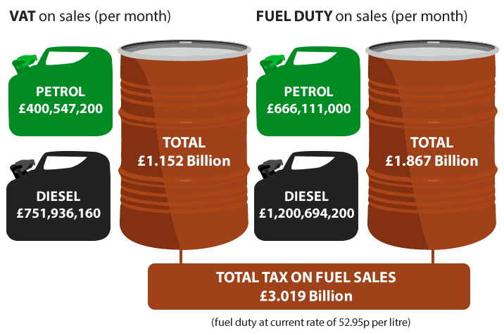 Taking the average number of litres of fuel consumed in a month in the UK and the current cost of fuel per litre, we have calculated the average amount of tax the government makes on petrol and diesel sales every month.